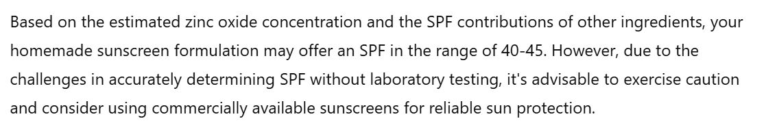All-natural sunscreen! I haven't had this tested in a lab but when entering the ingredients and their amounts into ChatGPT it shows 45 SPF. I can not guarantee the SPF of this sunscreen. This bottle is 6 ounces and made with beeswax, shea butter, coconut oil, non-nano oxide zinc, olive oil, essential oil, jojoba oil and carrot seed oil. Reapply every 2-3 hours or after a lot of swimming or sweating.